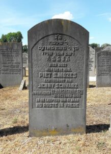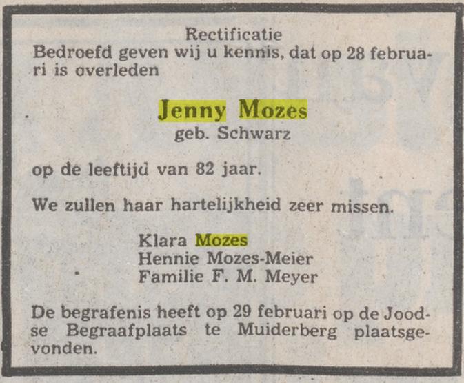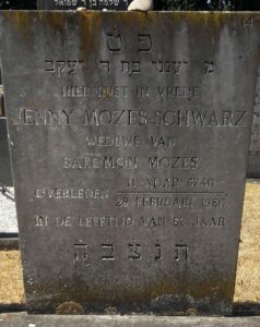 “Jenny Mozes geboren 2-11-1897 LABISCTIN onder de naam Jenny Schwartz is overleden op 28-2-1980 in Laren. Zij is begraven op 29-2-1980 op de begraafplaats Muiderberg veld F rij 20 graf 14
