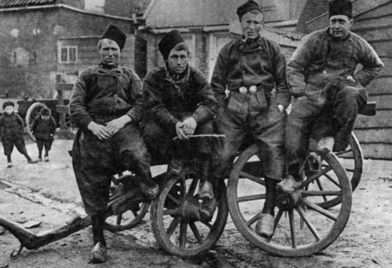 Op de lege wagen poseren v.l.n.r. Jacob Post, Louwe van Dokkum, Lub Weerstand en Klaas Asma
