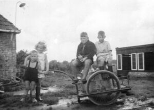 Na een van de bezoeken van pake mocht ik mee naar Friesland. Achter op de fiets naar Lemmer en verder grotendeels met de bus. De fiets werd door de buschauffeur samen met andere fietsen vast gemaakt op de bovenkant van de bus. Een paar keer moesten overstappen op een andere bus en werd de fiets van de ene bus naar de andere over gebracht. In Sloten hadden we een langere wachttijd en zijn we in een café gaan zitten wachten en aten we onze meegenomen boterhammen. Pake met koffie en ik met een flesje frisdrank. Van de boerderij herinner ik mij o.a. het slapen in de bedstee, het keldertje met de weckpotten. en de zolder waar de gedroogde appeltjes lagen. Met pake op de boerenkar met het paard ervoor. De kippen, een paar varkens en pakweg 7 koeien. Met dat kleine boerderijtje hadden ze in mijn herinnering een goed bestaan.